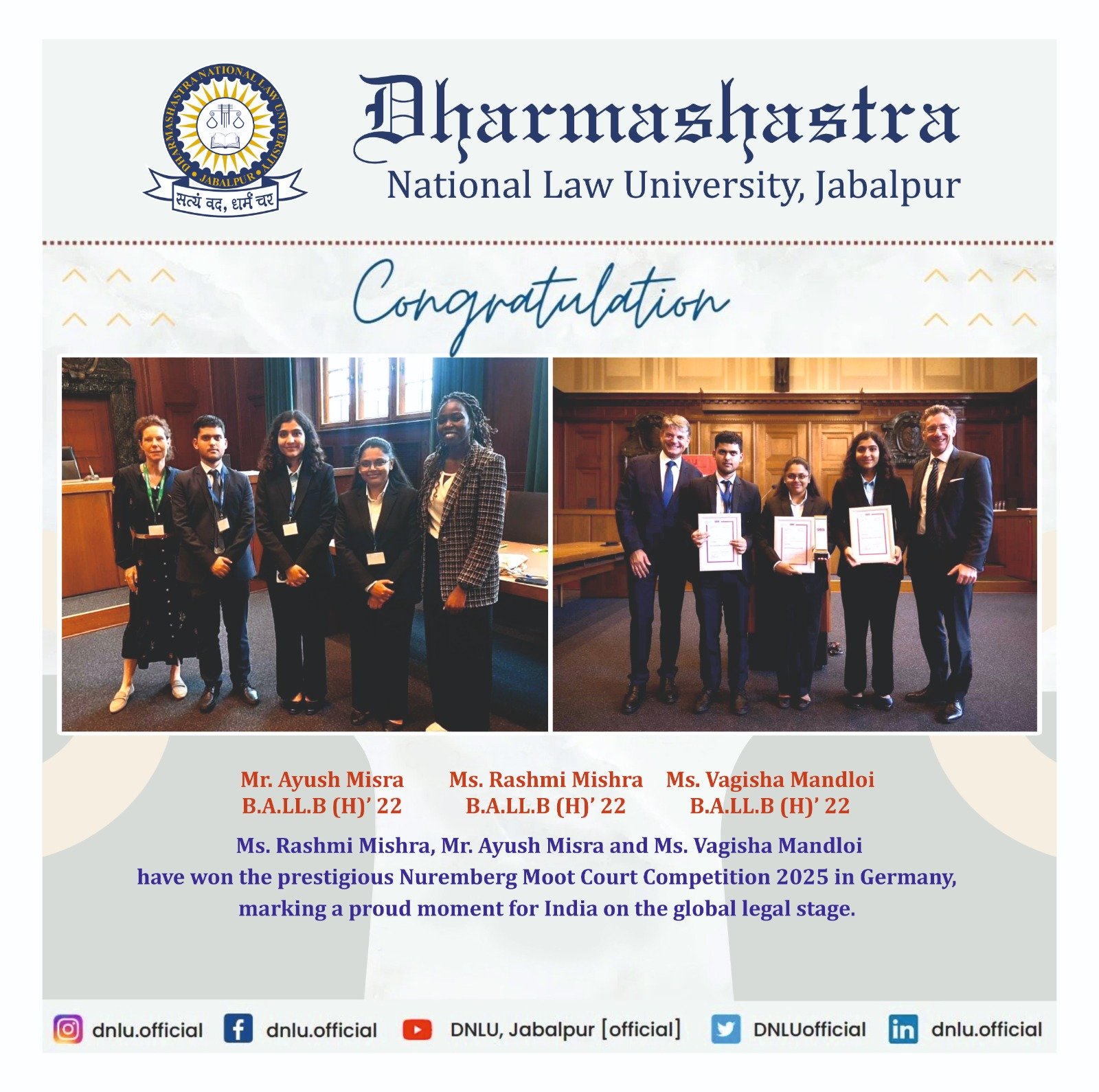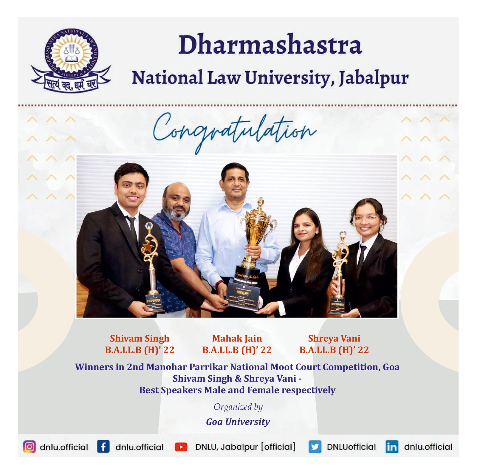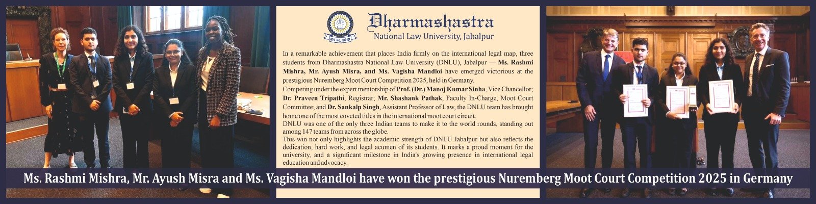 Dharmashastra National Law University, Jabalpur, M.P. (DNLU) was established in the year 2018 by the Madhya Pradesh Dharmashastra National Law University Act (24 of 2018), with the object of advancing the cause of legal education and achieving excellence as a University for imparting value-based legal education to undergraduate and postgraduate students as well as research scholars. The Chancellor of the University is the Hon’ble Chief Justice of the High Court of Madhya Pradesh. The University, in addition to the advice and wisdom shared by the Hon’ble Chief Justice, has the advantage of acquiring guidance from other judges of the High Court as well. The Administrative Judges overseeing the University's functioning are Senior Judges from the High Court. Read More