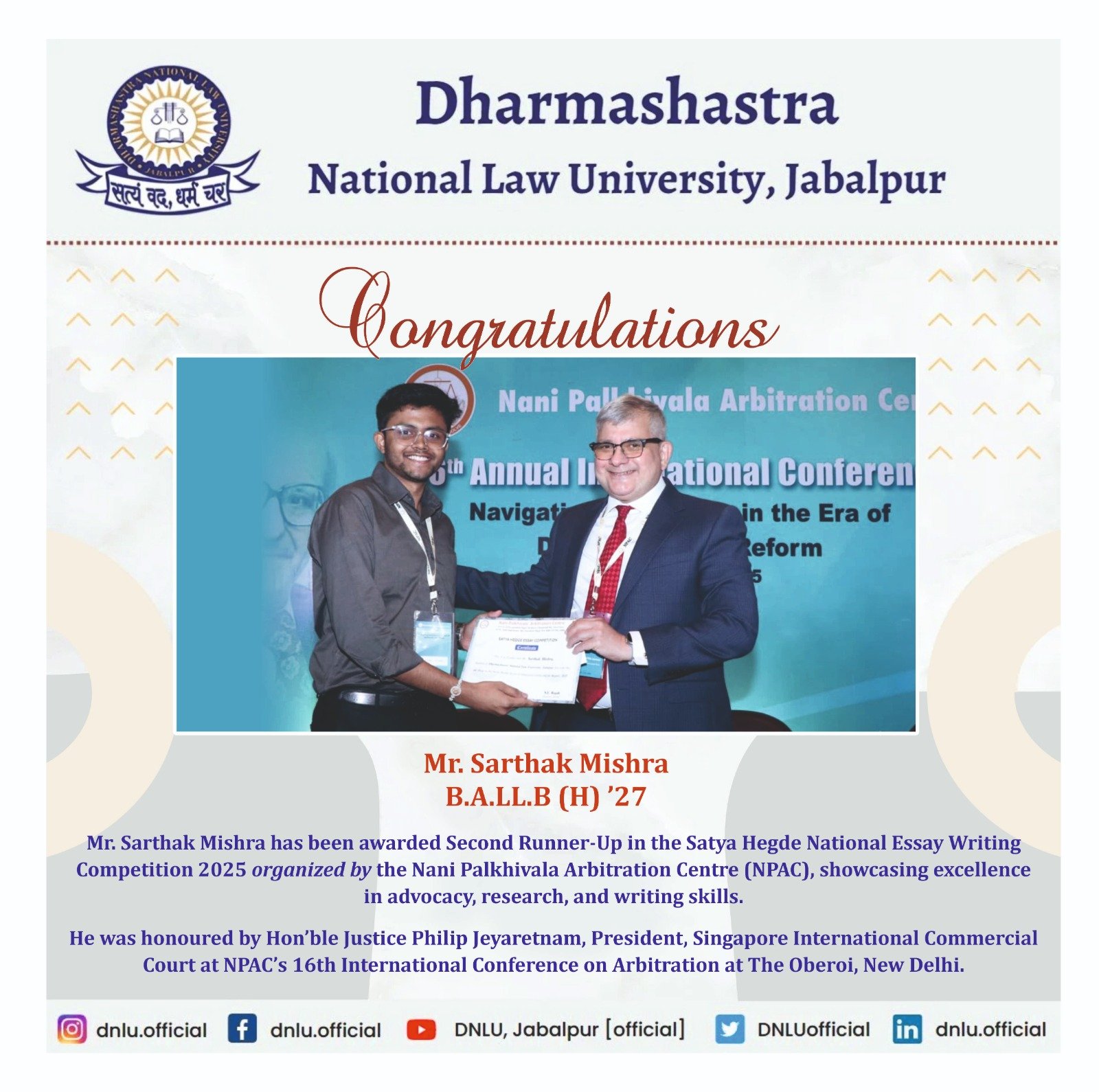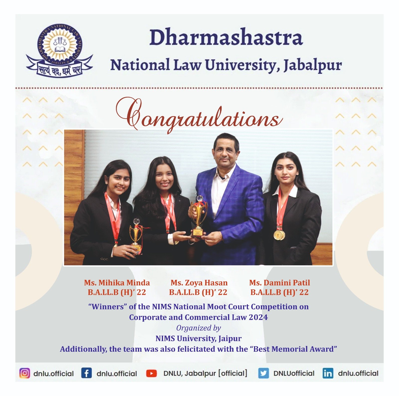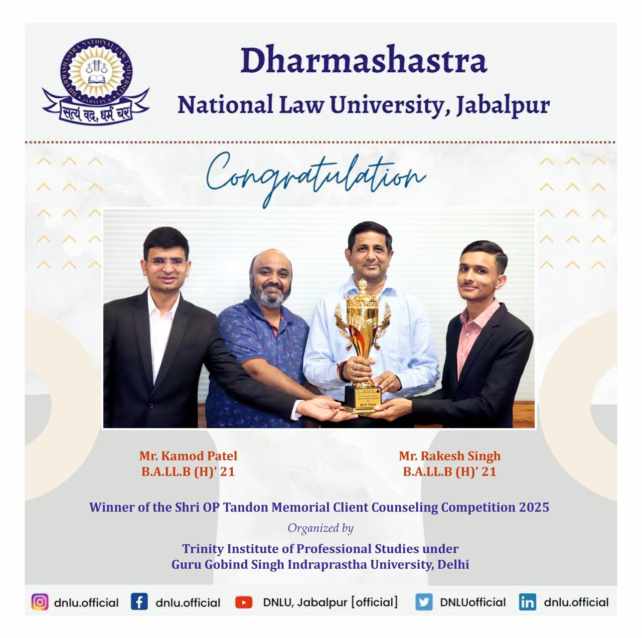 Dharmashastra National Law University, Jabalpur, M.P. (DNLU) was established in the year 2018 by the Madhya Pradesh Dharmashastra National Law University Act (24 of 2018), with the object of advancing the cause of legal education and achieving excellence as a University for imparting value-based legal education to undergraduate and postgraduate students as well as research scholars. The Chancellor of the University is the Hon’ble Chief Justice of the High Court of Madhya Pradesh. The University, in addition to the advice and wisdom shared by the Hon’ble Chief Justice, has the advantage of acquiring guidance from other judges of the High Court as well. The Administrative Judges overseeing the University's functioning are Senior Judges from the High Court. Read More